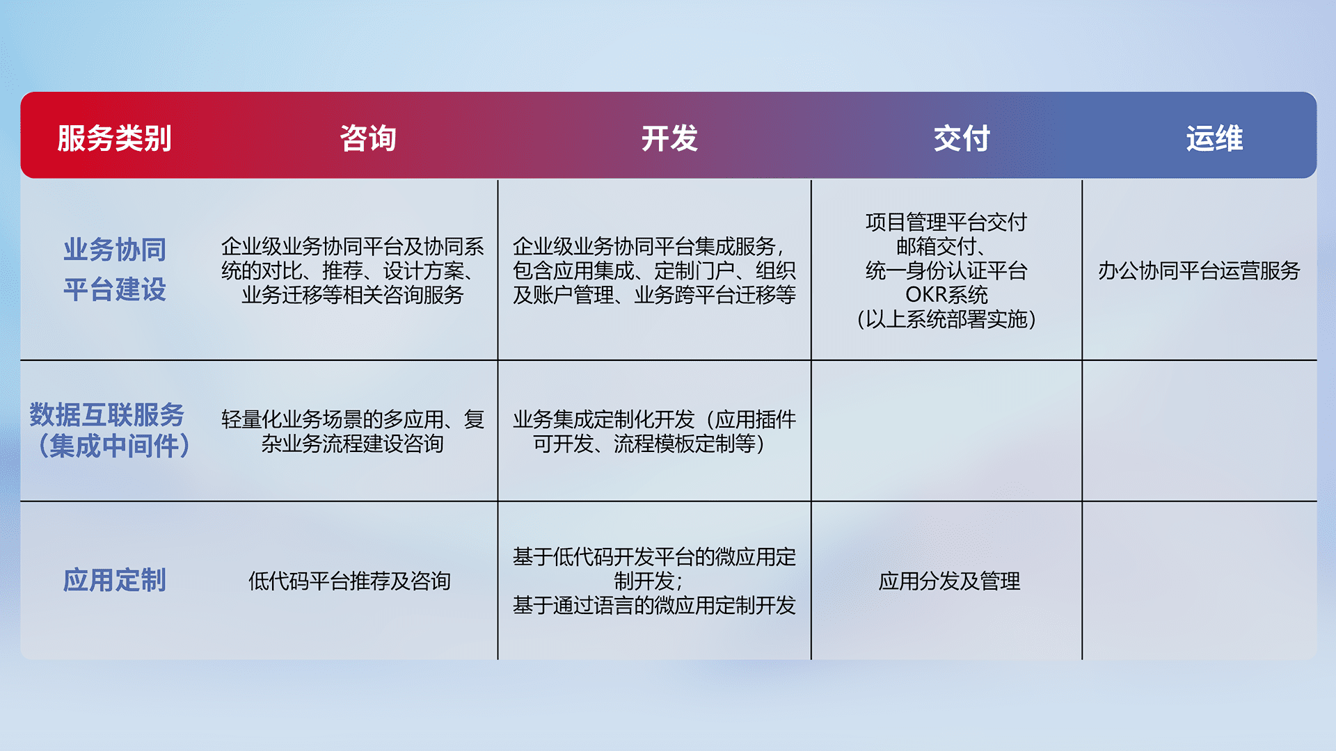 针对钉钉、、、企微、、IDaas等平台级产品提供产品的规划、、方案、、、交付、、定制化开发等服务,,,,实现如统一协同办公、、、智能客户服务、、、、混合会议管理、、智能数据查询、、等业务场景,,,实现数字化转型。。