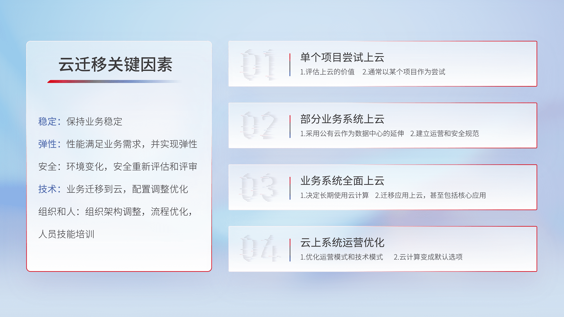 结合实际业务,,,从规划设计、、云平台选型、、、云原生改造、、、、数据迁移、、、集成交付,,,迁移全过程为客户识别最佳上云路径,,,做好风险识别管理,,设计网络架构、、、身份权限、、安全审计合规、、、操作审计、、、日志审计、、、监控告警策略、、、、多站点容灾设计等,,对云上基础设施进行整体规划,,提升IT治理水平,,,以满足弹性、、高可用、、、高性能的需求。。