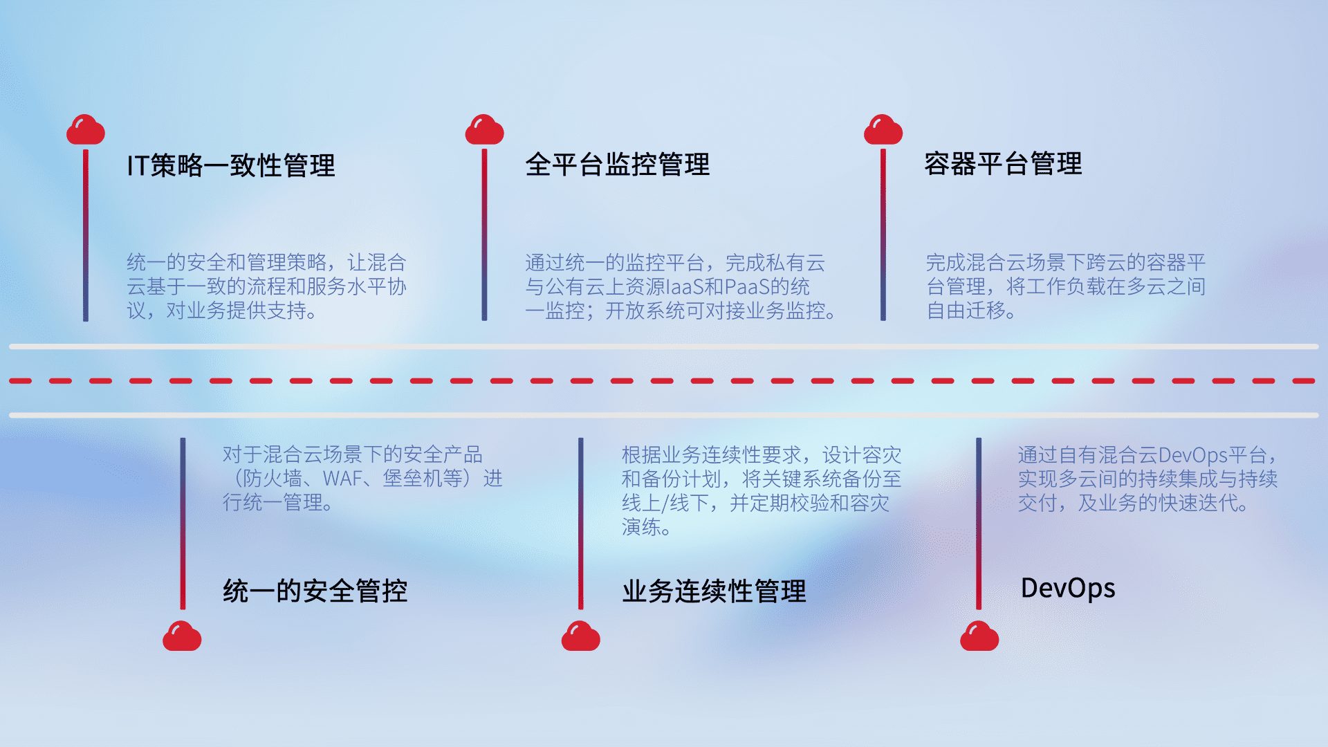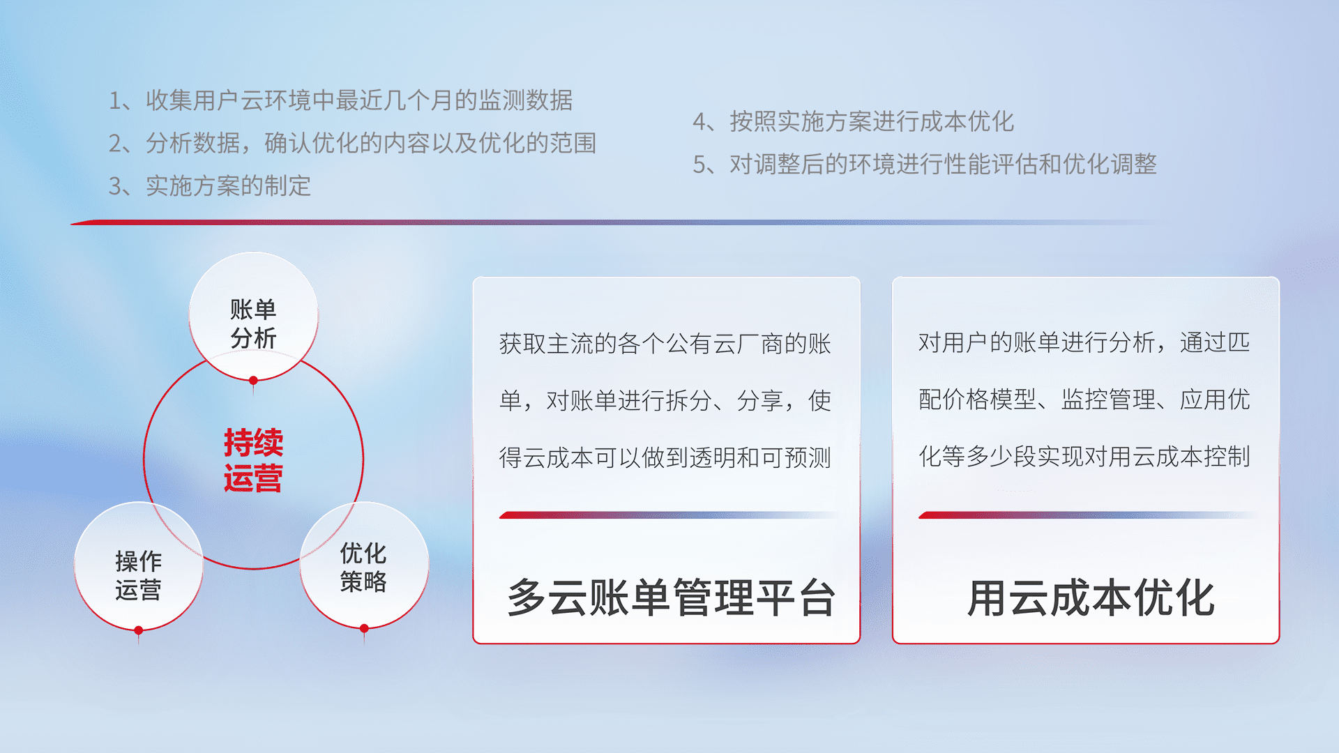 通过多云纳管,,以统一的资源数据模型把客户的云资源进行抽象和封装,,进而实现对多云资源的统一操作,,,保障云资源管理的可靠性、、、稳定性与可用性。。。量身定制化运维内容,,配置、、开发运维、、补丁管理、、备份、、监控、、、认证和访问管理、、、审计和日常巡检等,,,,保障在用云过程中的可靠度,,稳定度以及高可用率。。。
